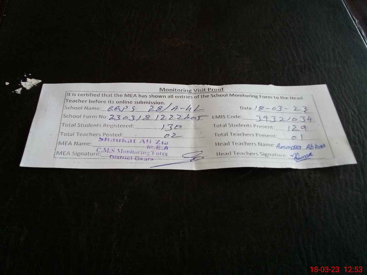 | Attendance Register | Head Teacher | MEA with School | Visit Proof |