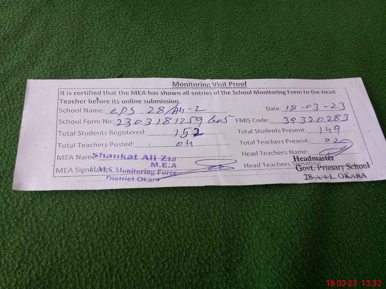 | Attendance Register | Head Teacher | MEA with School | Visit Proof |