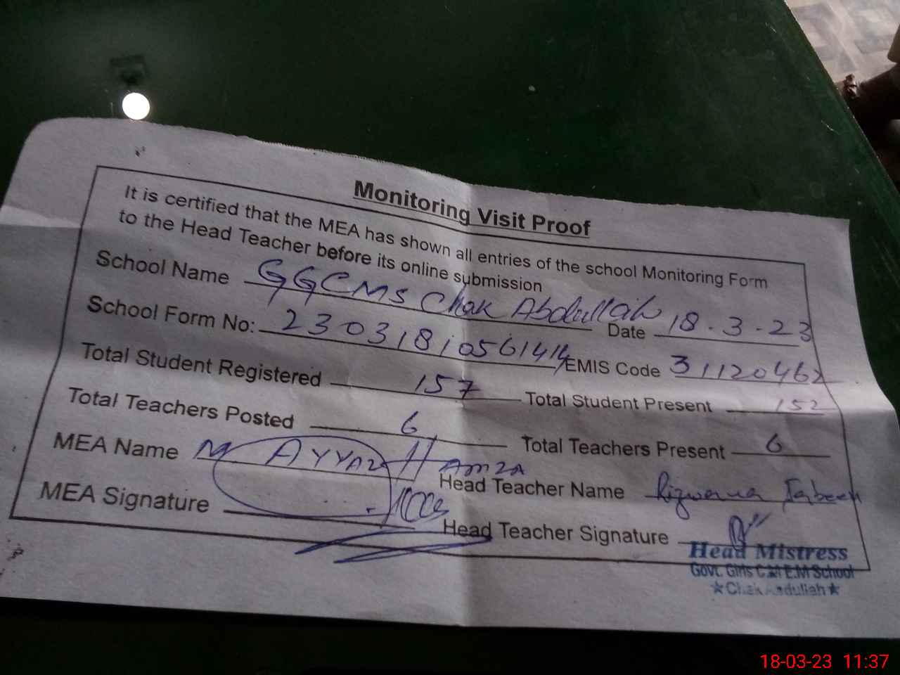 | Attendance Register | Head Teacher | MEA with School | Visit Proof |