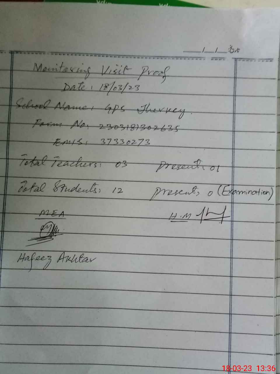 | Remarks (Use Separate Page if Required): Out of three teachers 01 teacher Afsheed Nawaz PST is on temp attachment and 01 teacher Azhar Mehmood PST is on Census duty Only 01teacher is present in school No student present in school at the time of visit Head teacher told that students have packed up today after paper NSB account is closed No FTF collection in school Head teacher told that all the 12 students are unable to pay fund | |||||
