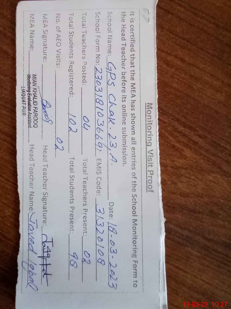 | EMIS Code: 31320108 | Name of School: GPS CHAK 23 A | |||