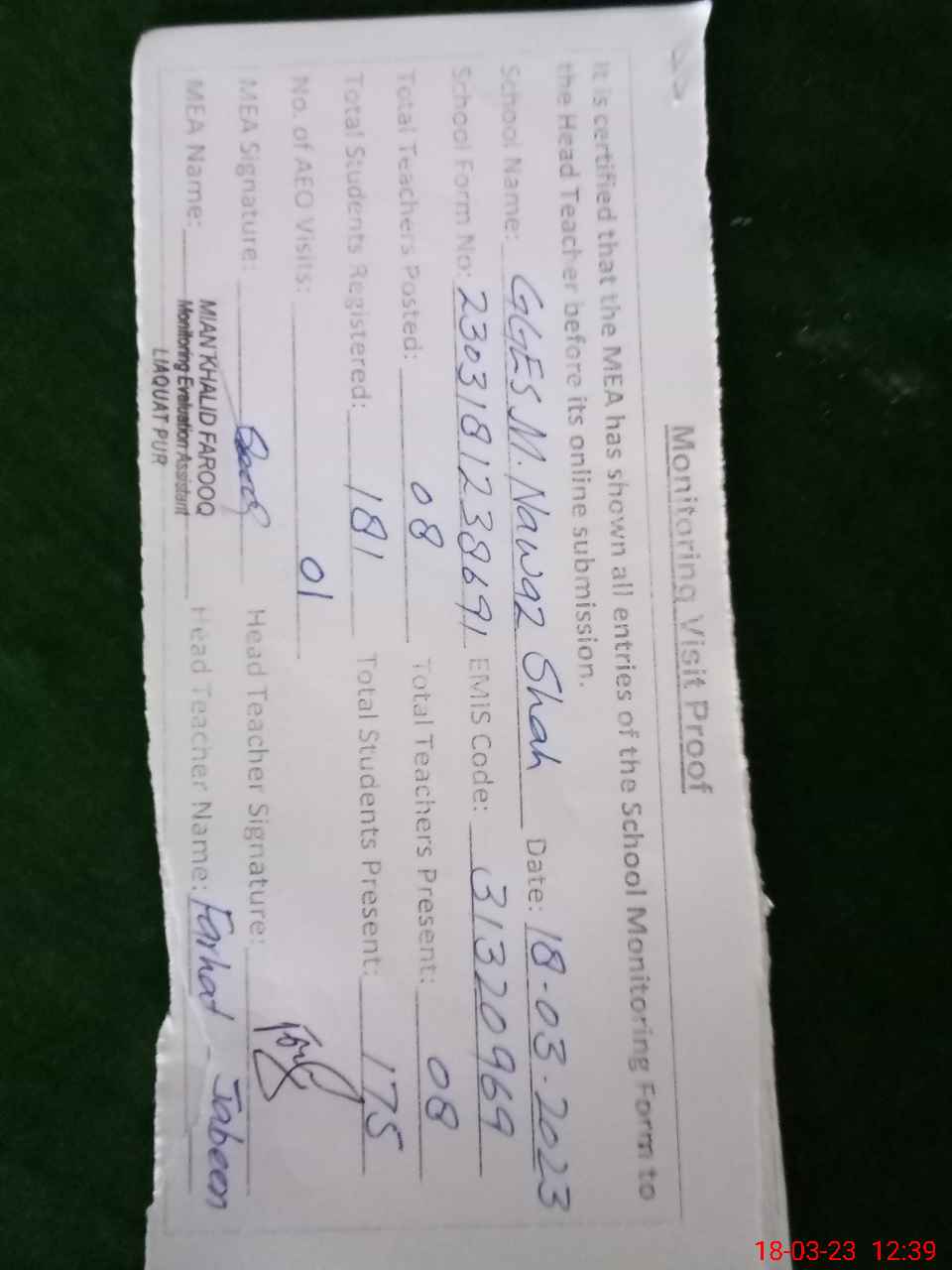 | Attendance Register | Head Teacher | MEA with School | Visit Proof |
