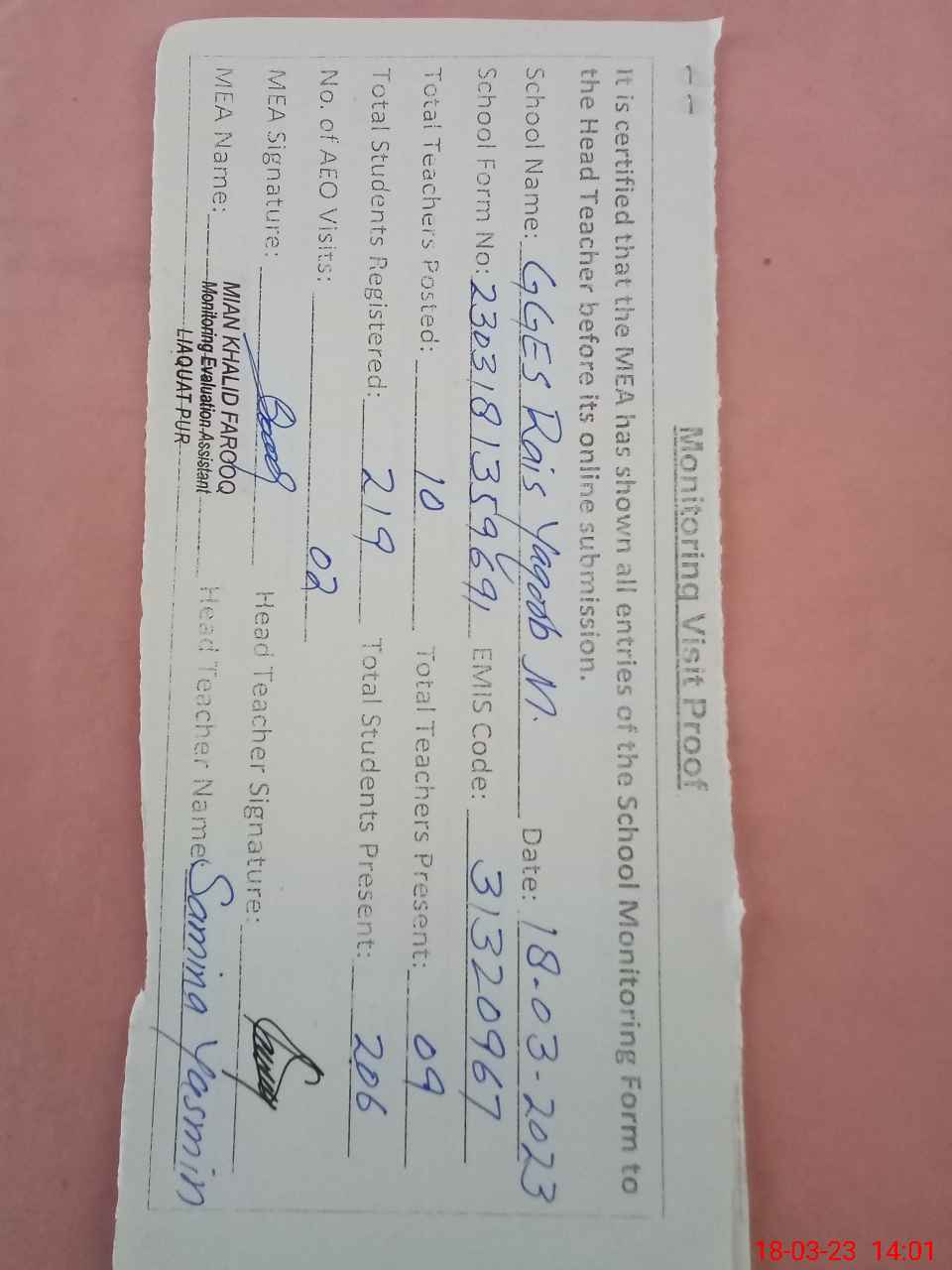 | EMIS Code: 31320967 | Name of School: GGES RAIS YAQOOB MUHAMMAD | |||