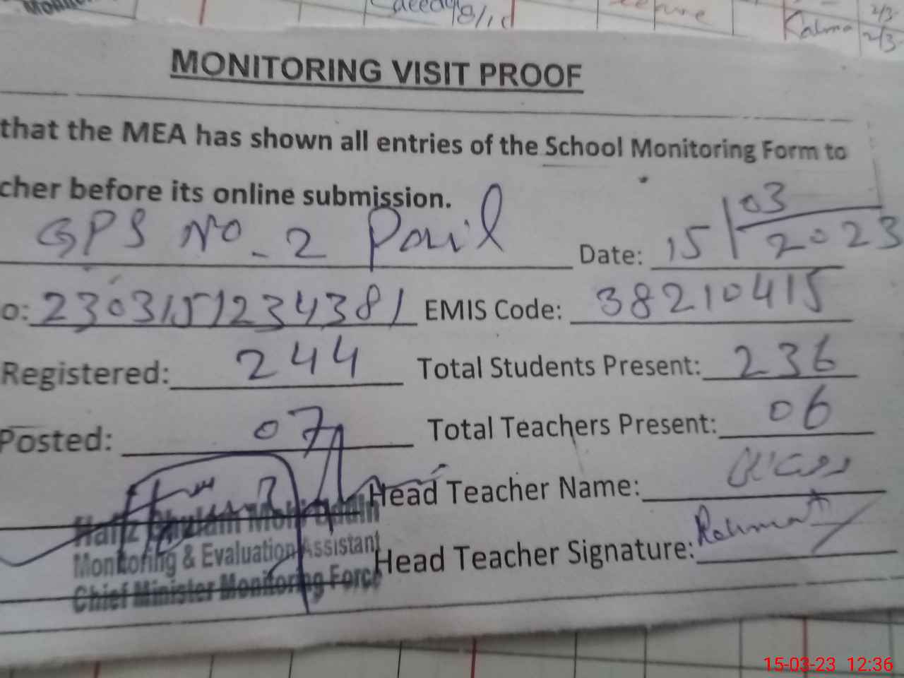 | Attendance Register | Head Teacher | MEA with School | Visit Proof |