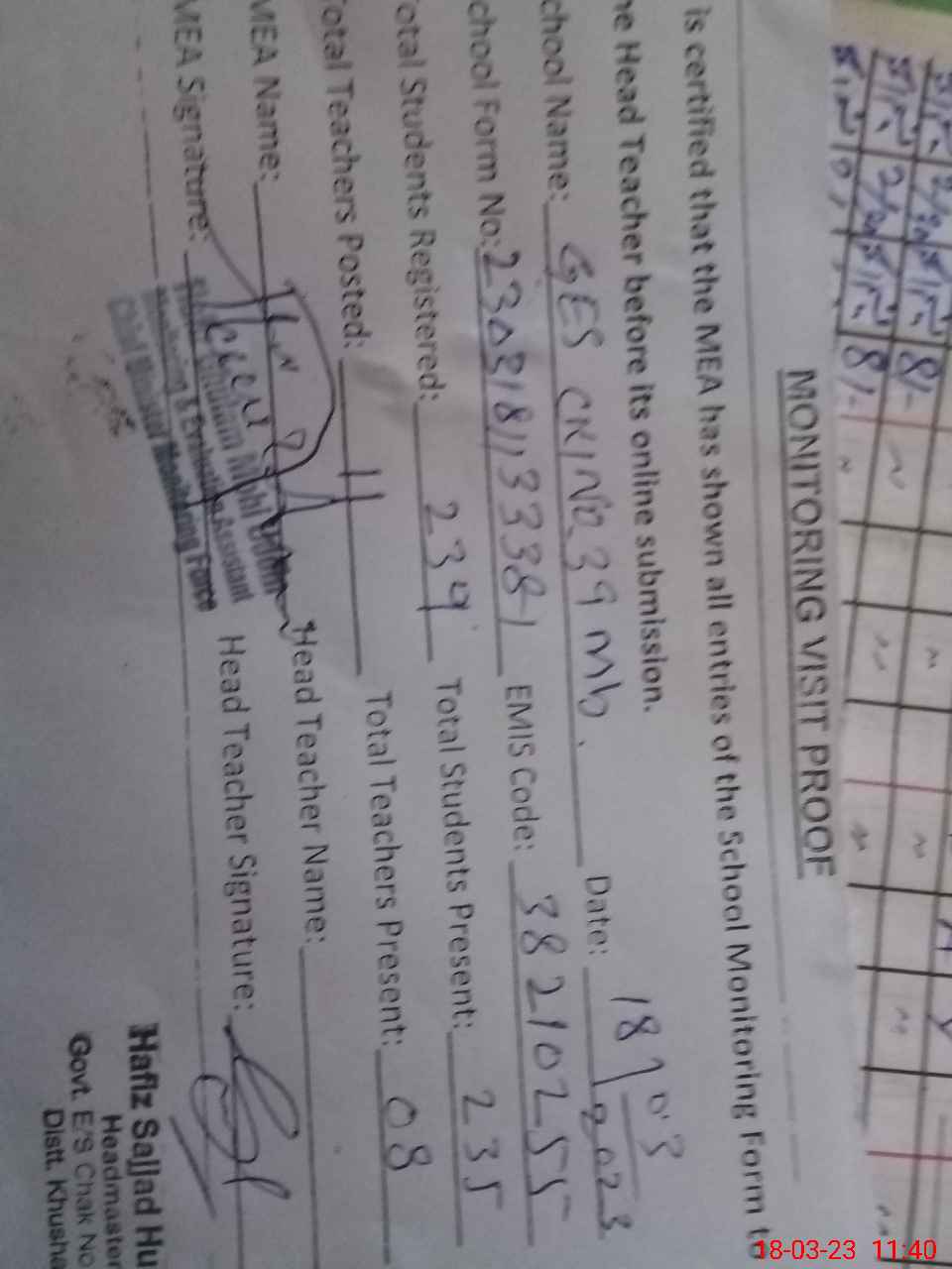 | Name: Ha**** Sa**** Hu**** Designation: (School Headmaster's/Headmistress's) S.S.T.(GEN) Phone/Cell Number: 03**** |