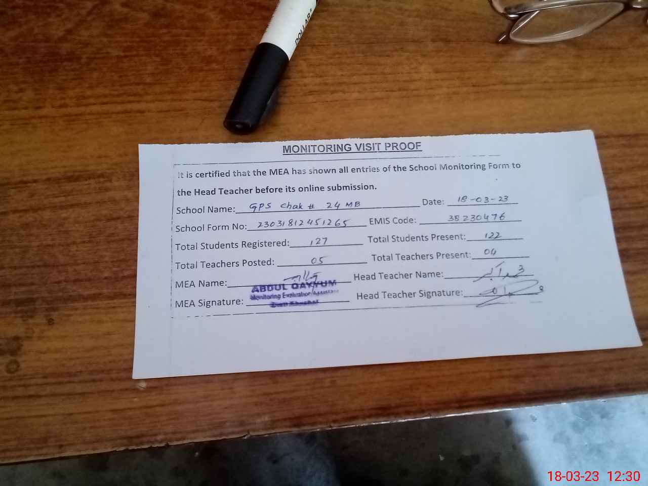 | Attendance Register | Head Teacher | MEA with School | Visit Proof |