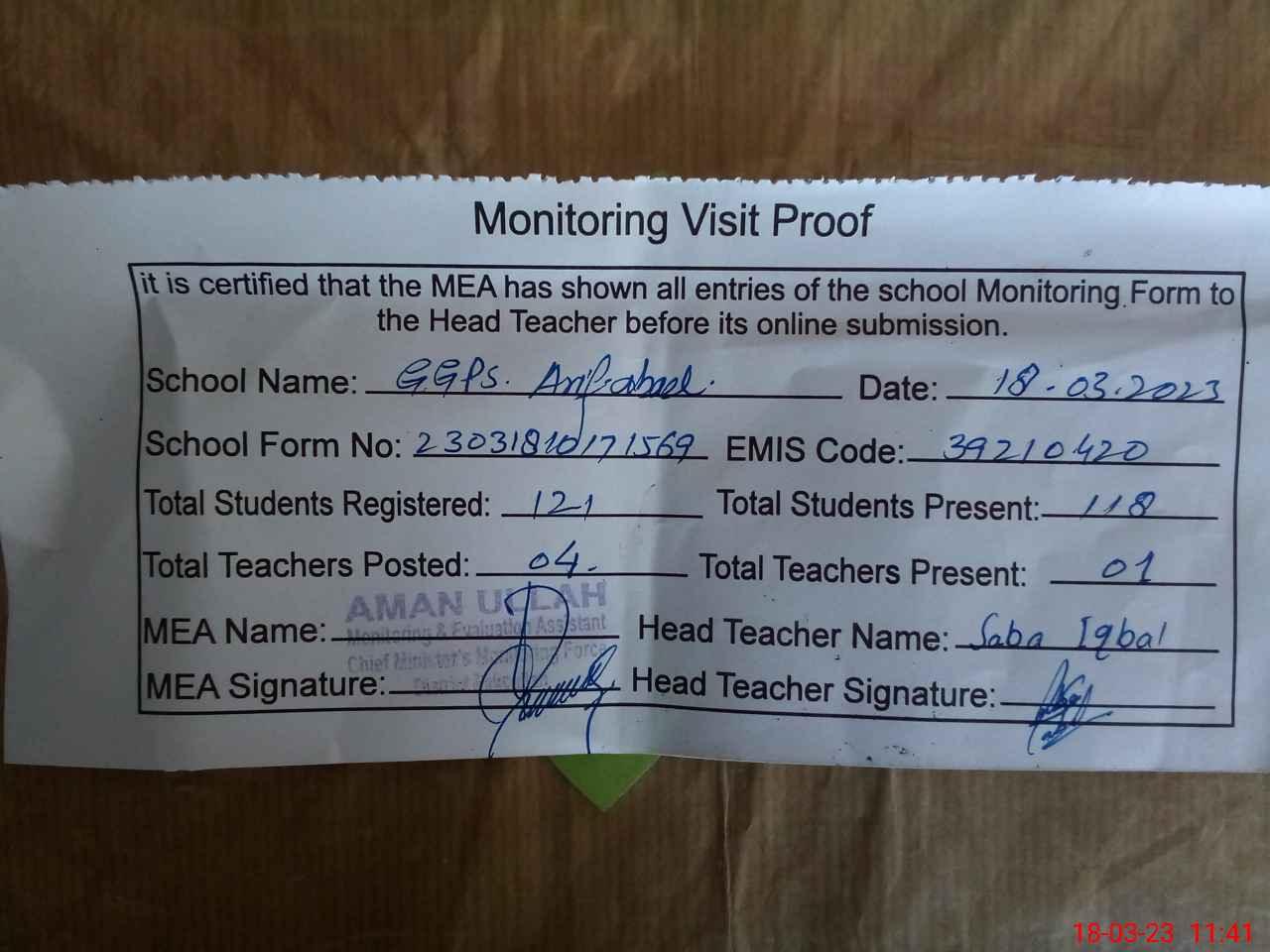 | EMIS Code: 39210420 | Name of School: GGPS ARIF ABAD | |||