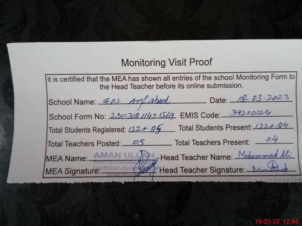 | EMIS Code: 39210124 | Name of School: GPS ARIF ABAD | |||