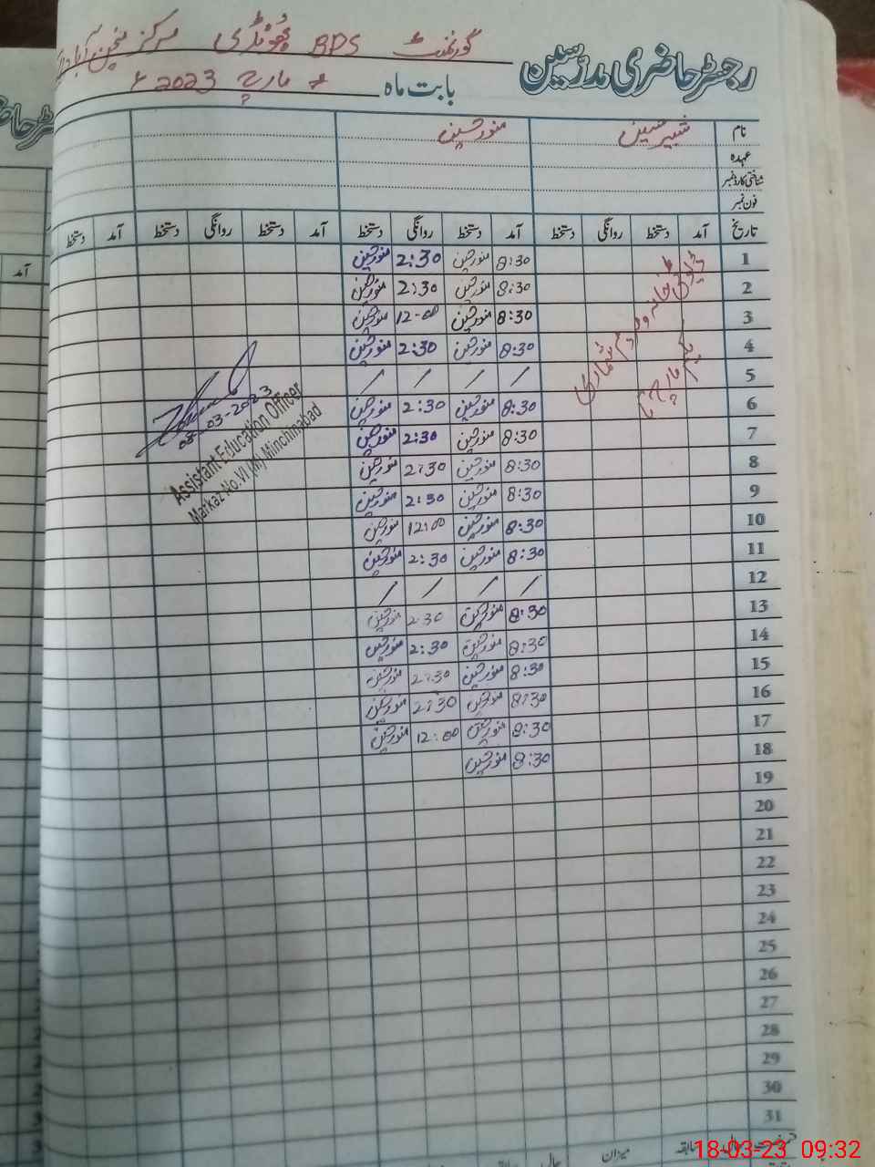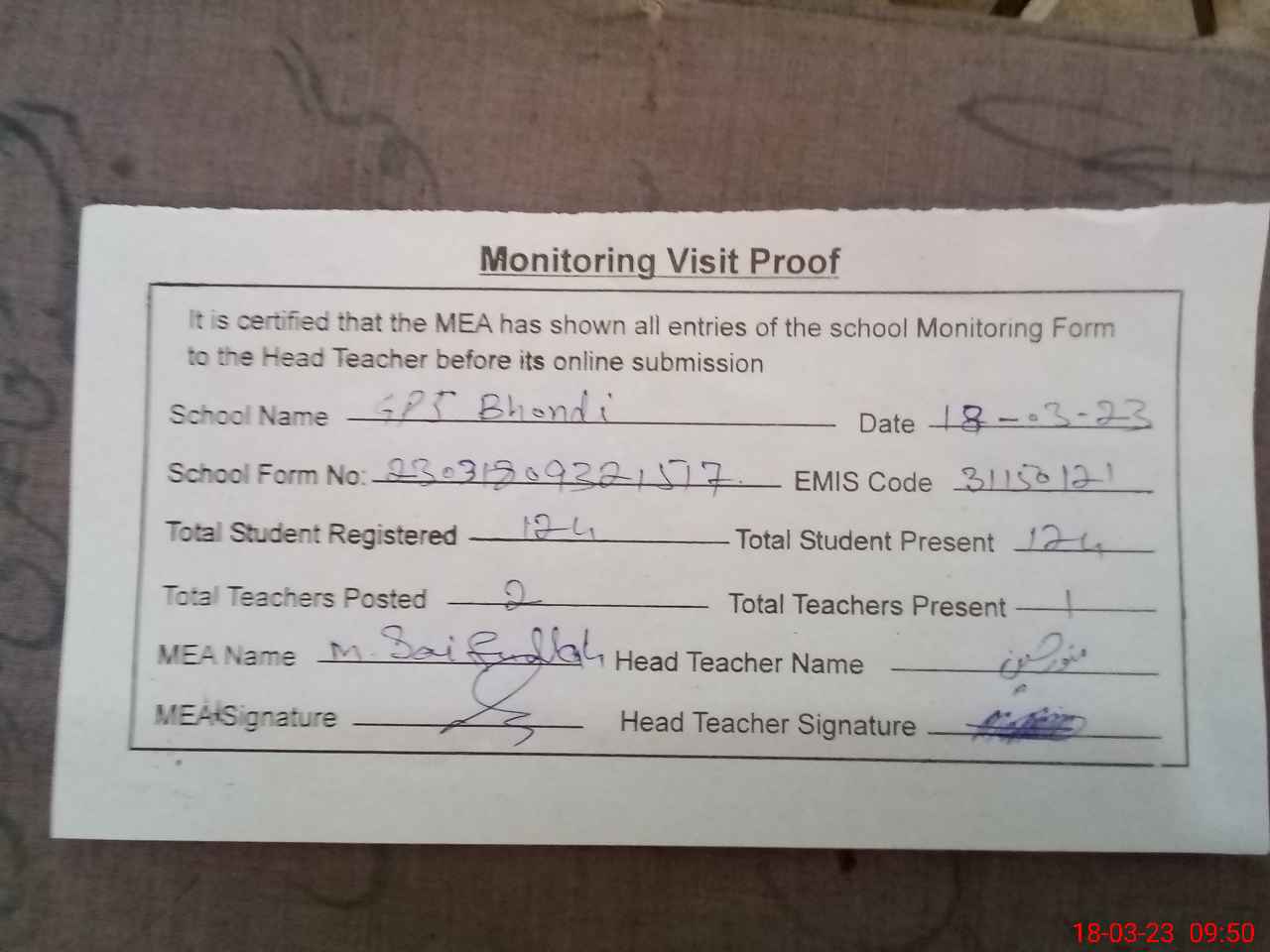| Attendance Register | Head Teacher | MEA with School | Visit Proof |