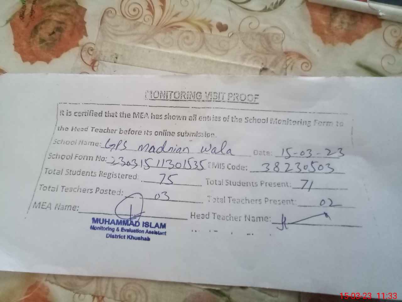 | Attendance Register | Head Teacher | MEA with School | Visit Proof |
