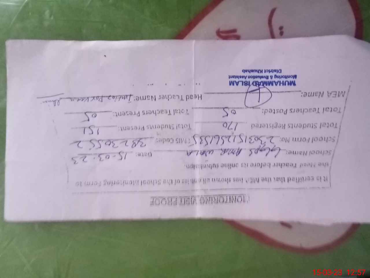 | Name: Im**** pe**** Designation: (School Headmaster's/Headmistress's) pst Phone/Cell Number: 03**** |