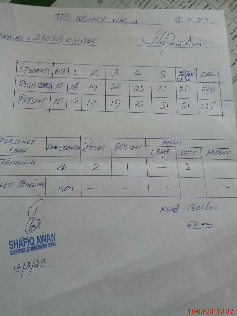 | Attendance Register | Head Teacher | MEA with School | Visit Proof |