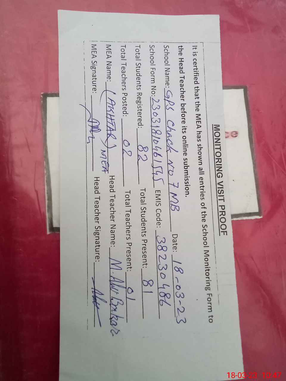 | EMIS Code: 38230486 | Name of School: GPS CHAK NO. 7 MB | |||