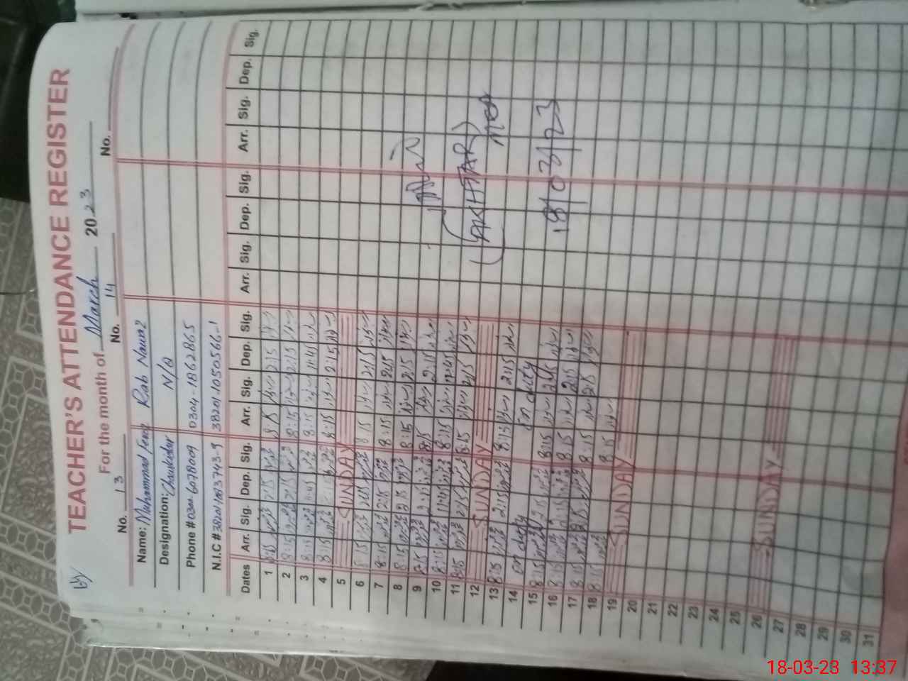 | Name: Sa**** Pe**** Designation: (School Headmaster's/Headmistress's) SSE_Bio Phone/Cell Number: 03**** |