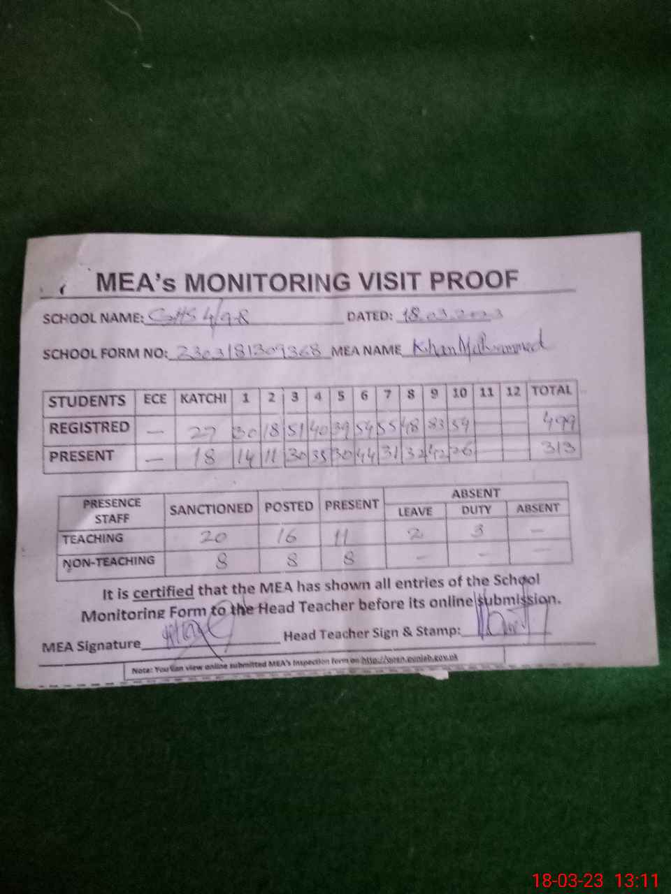| Attendance Register | Head Teacher | MEA with School | Visit Proof |