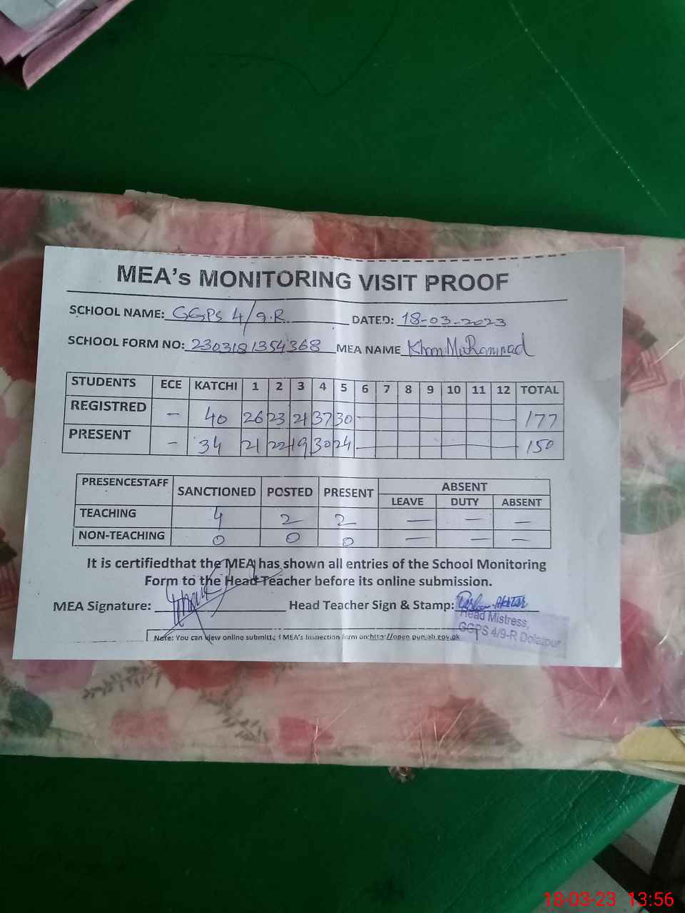 | Attendance Register | Head Teacher | MEA with School | Visit Proof |
