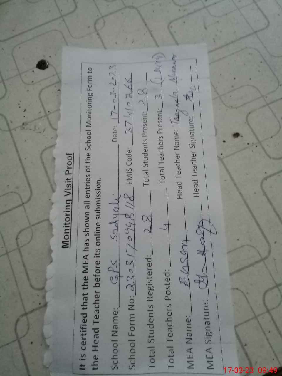 | Attendance Register | Head Teacher | MEA with School | Visit Proof |