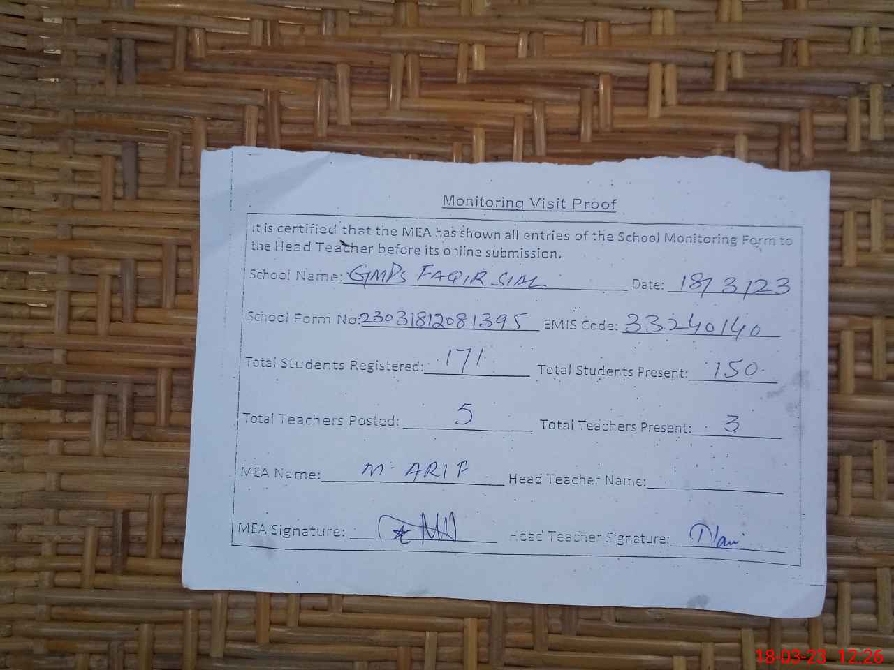 | Attendance Register | Head Teacher | MEA with School | Visit Proof |