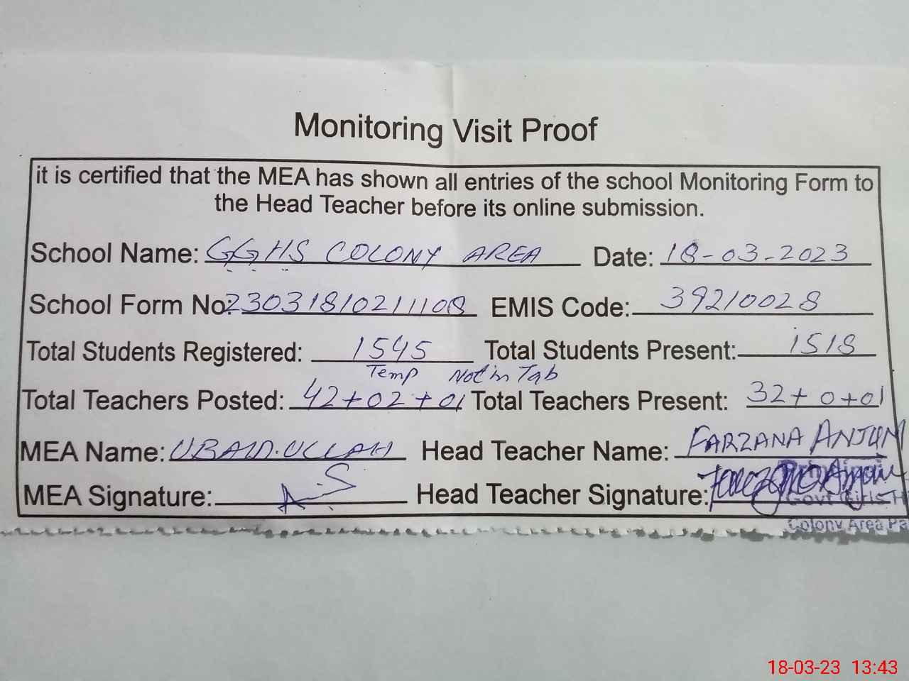 | Attendance Register | Head Teacher | MEA with School | Visit Proof |