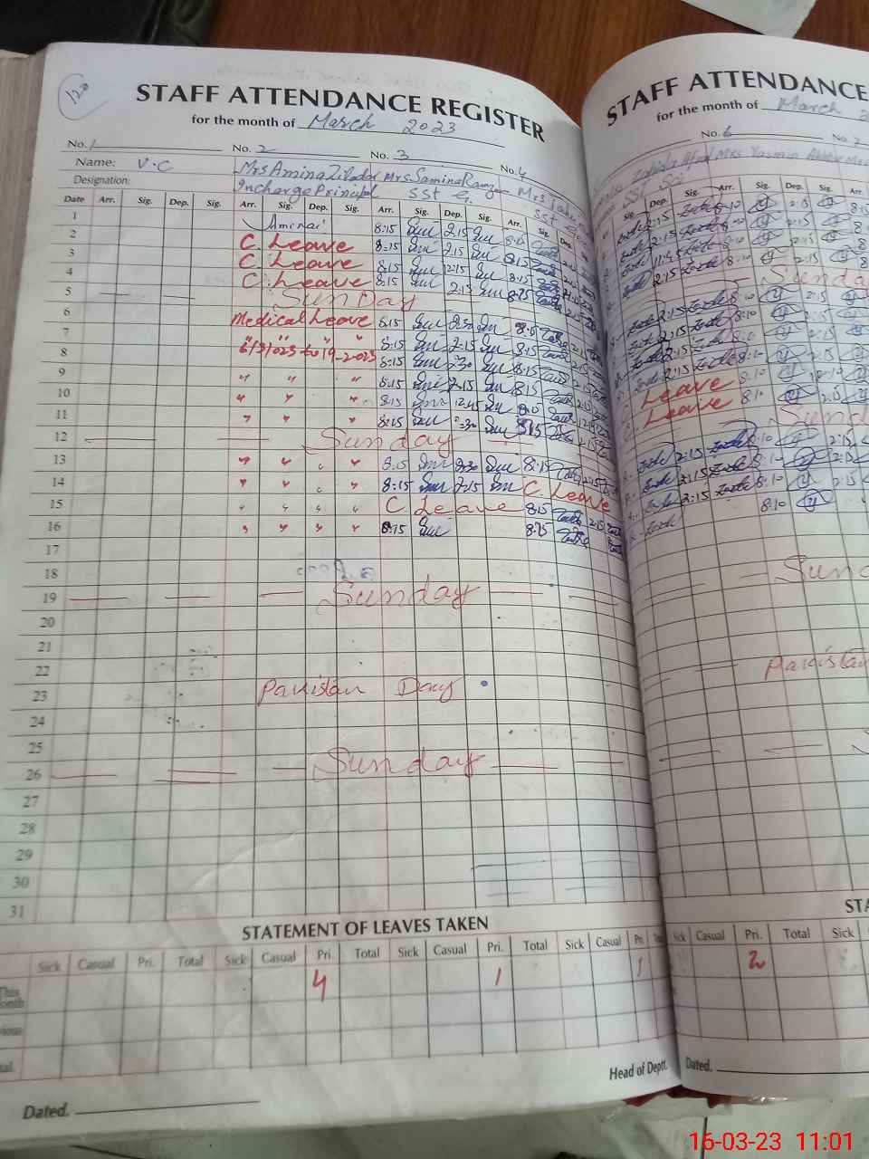| Leave | Duty | Absent | Maternity | Medical | Ex- Pak |