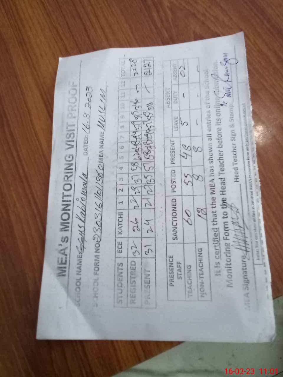 | Attendance Register | Head Teacher | MEA with School | Visit Proof |