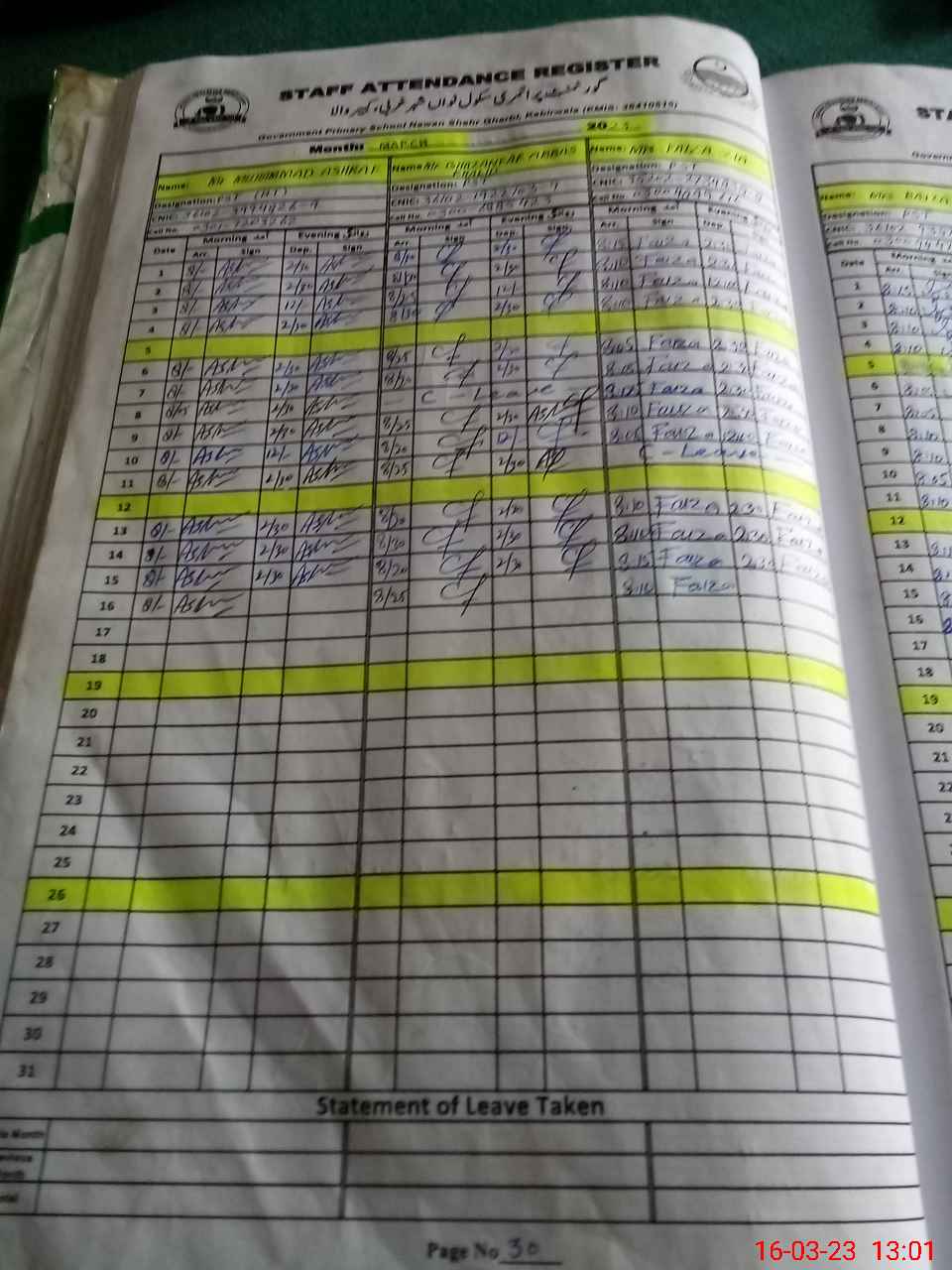 | CNIC | Full Name | Designation | R/C | Absence During Last Calender Month |