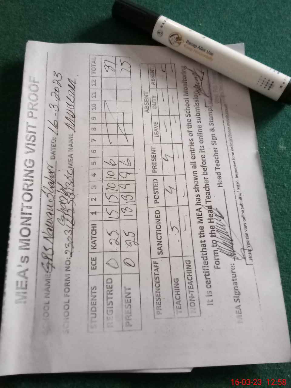 | Attendance Register | Head Teacher | MEA with School | Visit Proof |