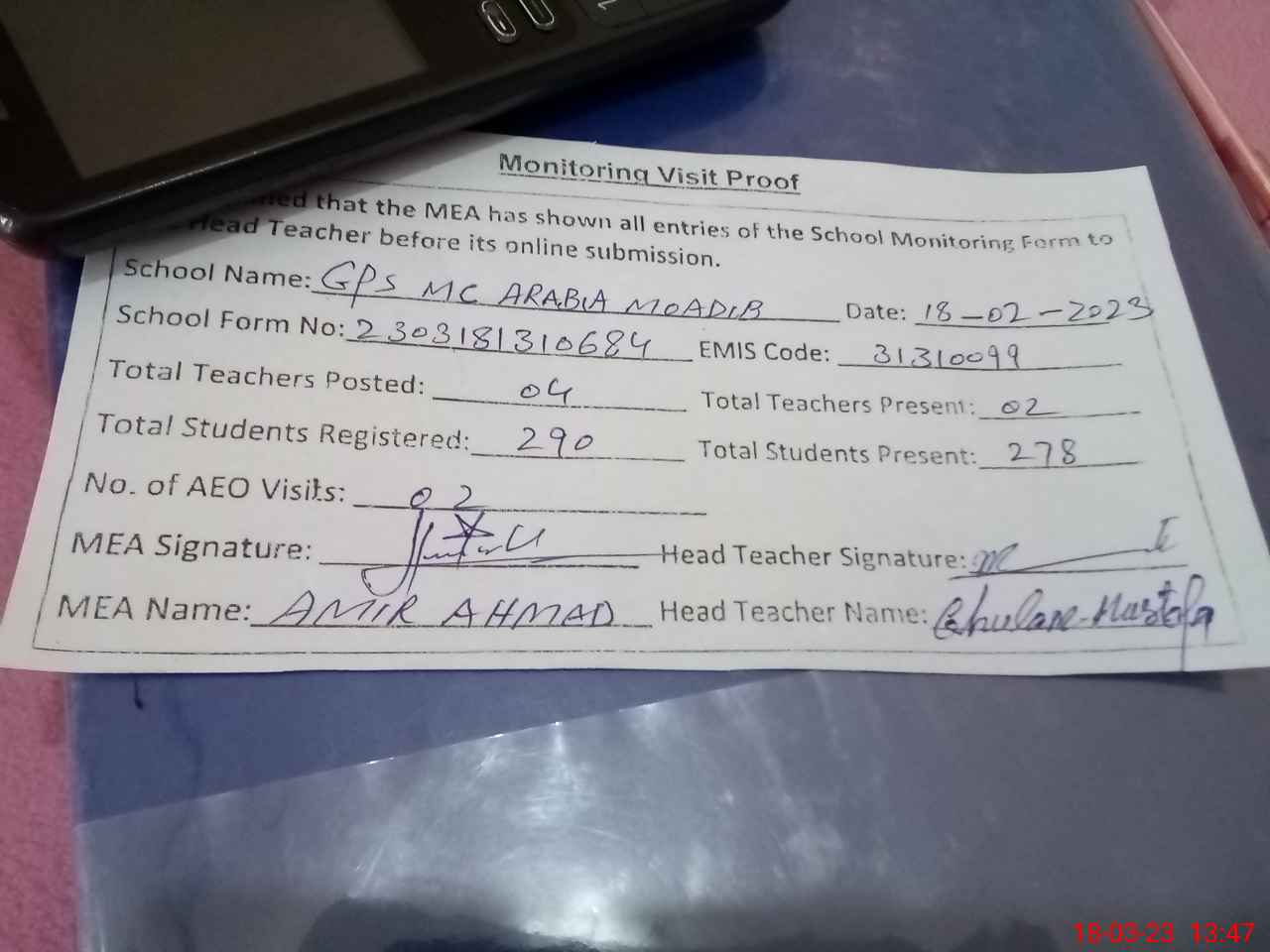| Attendance Register | Head Teacher | MEA with School | Visit Proof |