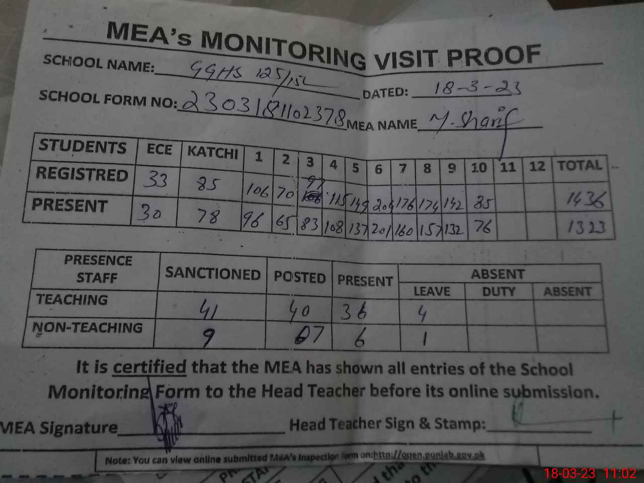 | Attendance Register | Head Teacher | MEA with School | Visit Proof |
