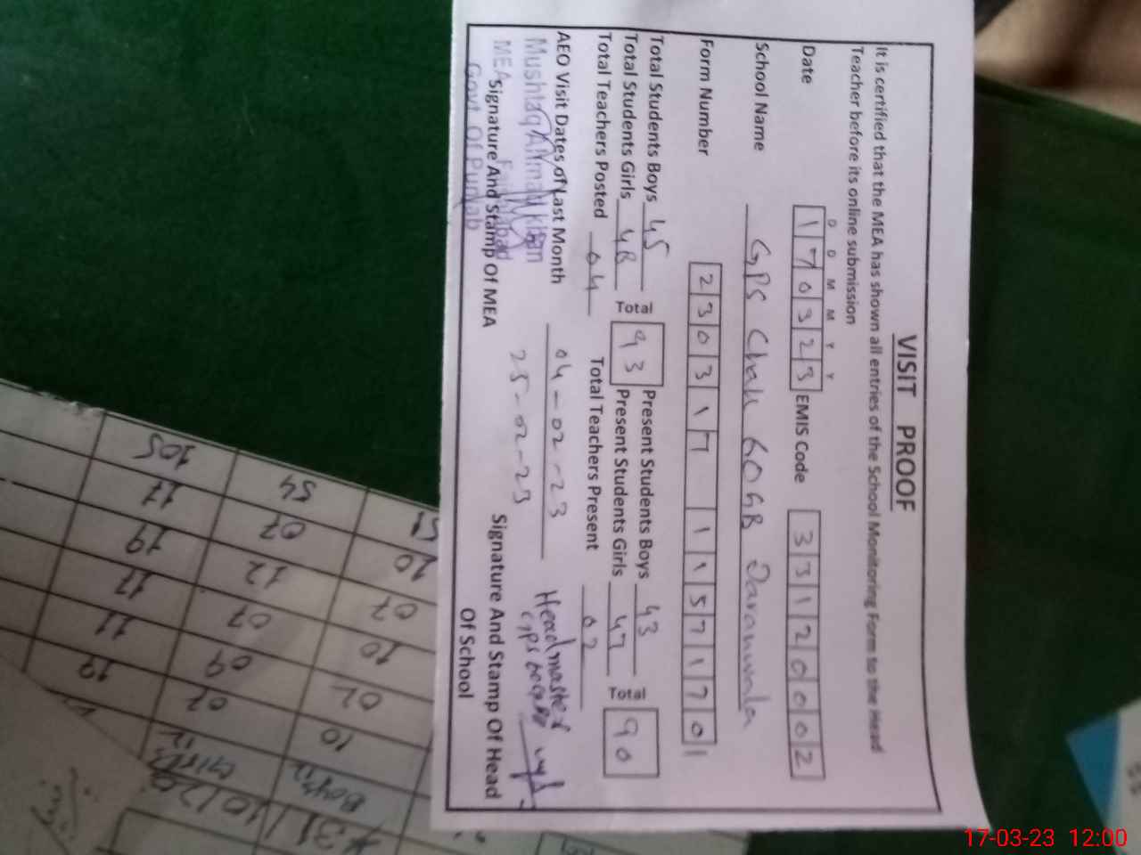 | Attendance Register | Head Teacher | MEA with School | Visit Proof |