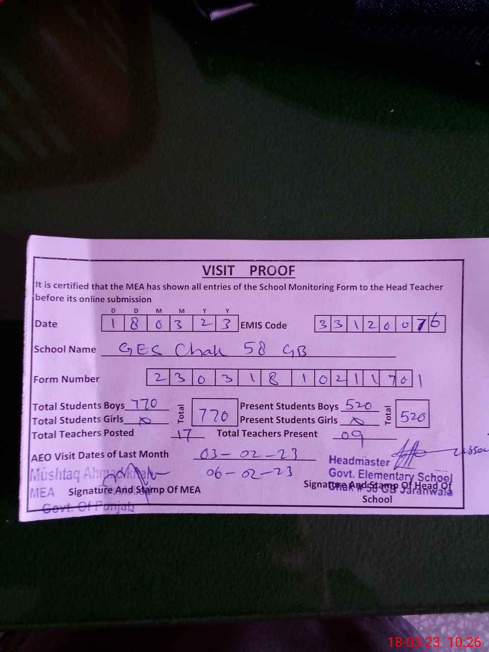 | Attendance Register | Head Teacher | MEA with School | Visit Proof |