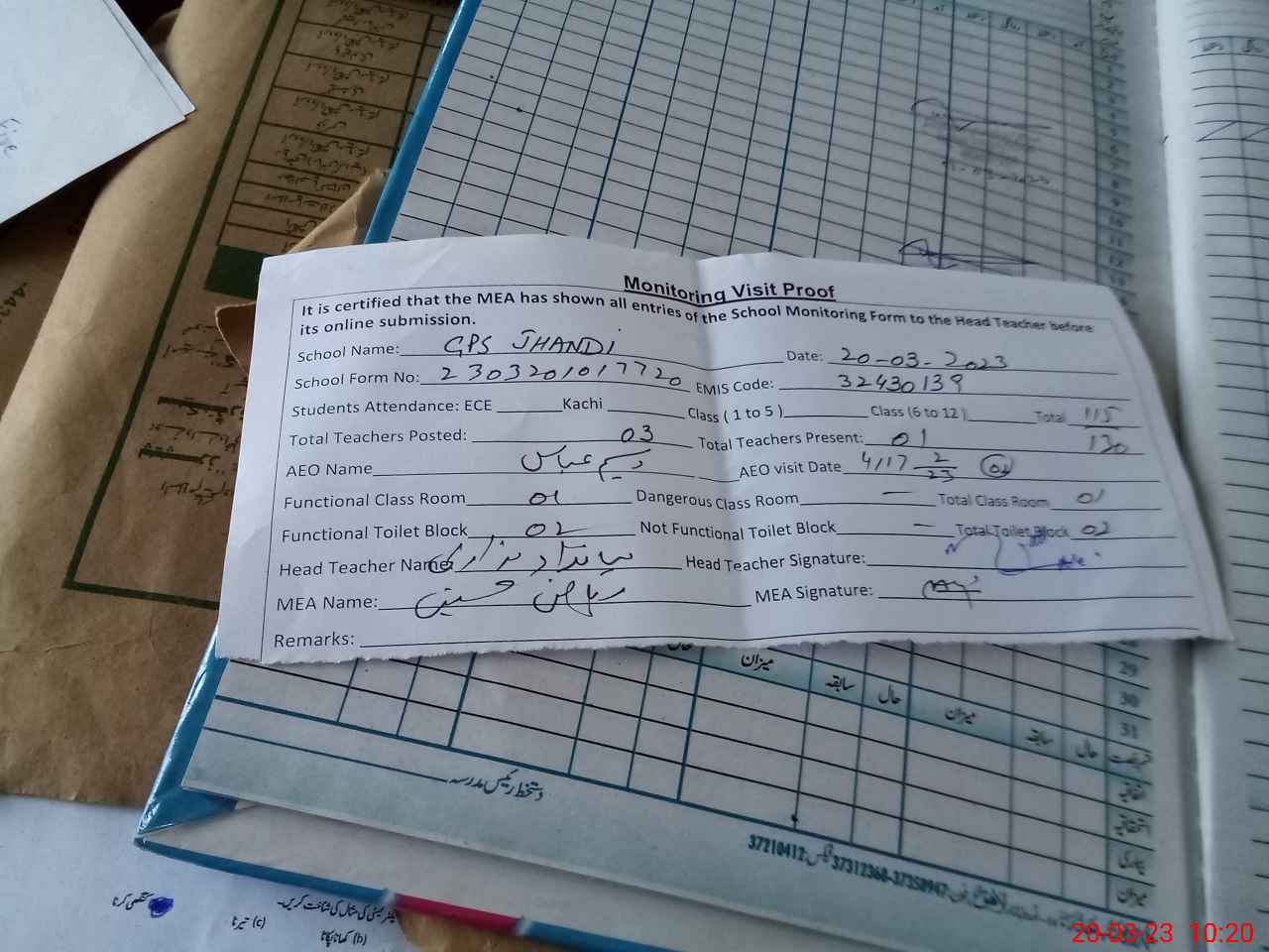 | Attendance Register | Head Teacher | MEA with School | Visit Proof |