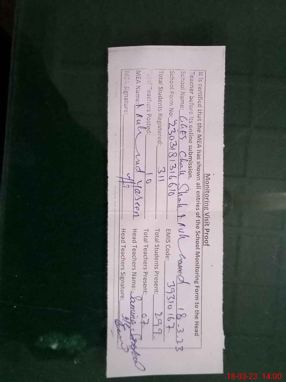 | Attendance Register | Head Teacher | MEA with School | Visit Proof |