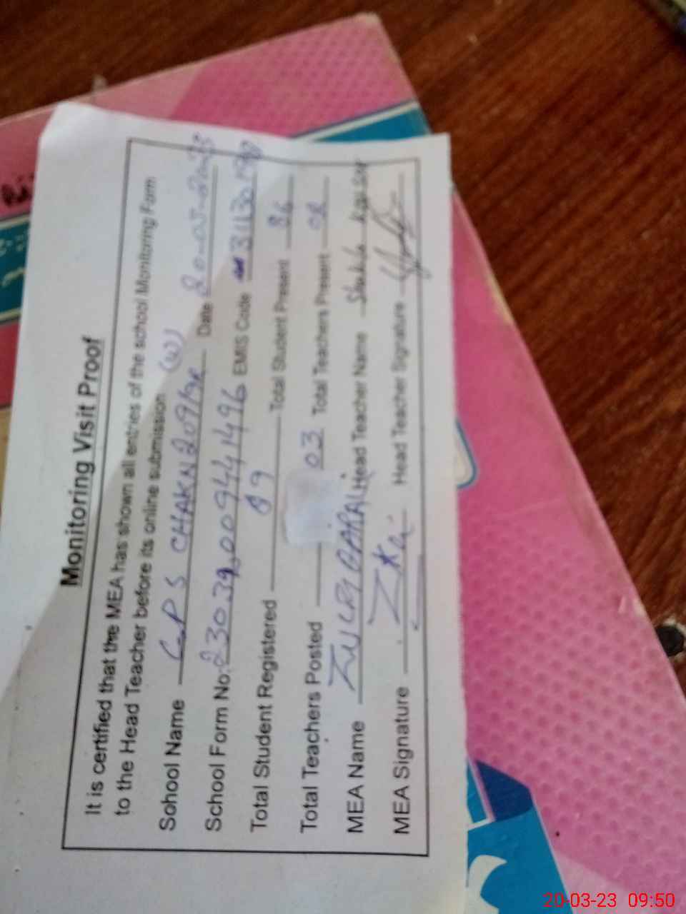 | Attendance Register | Head Teacher | MEA with School | Visit Proof |