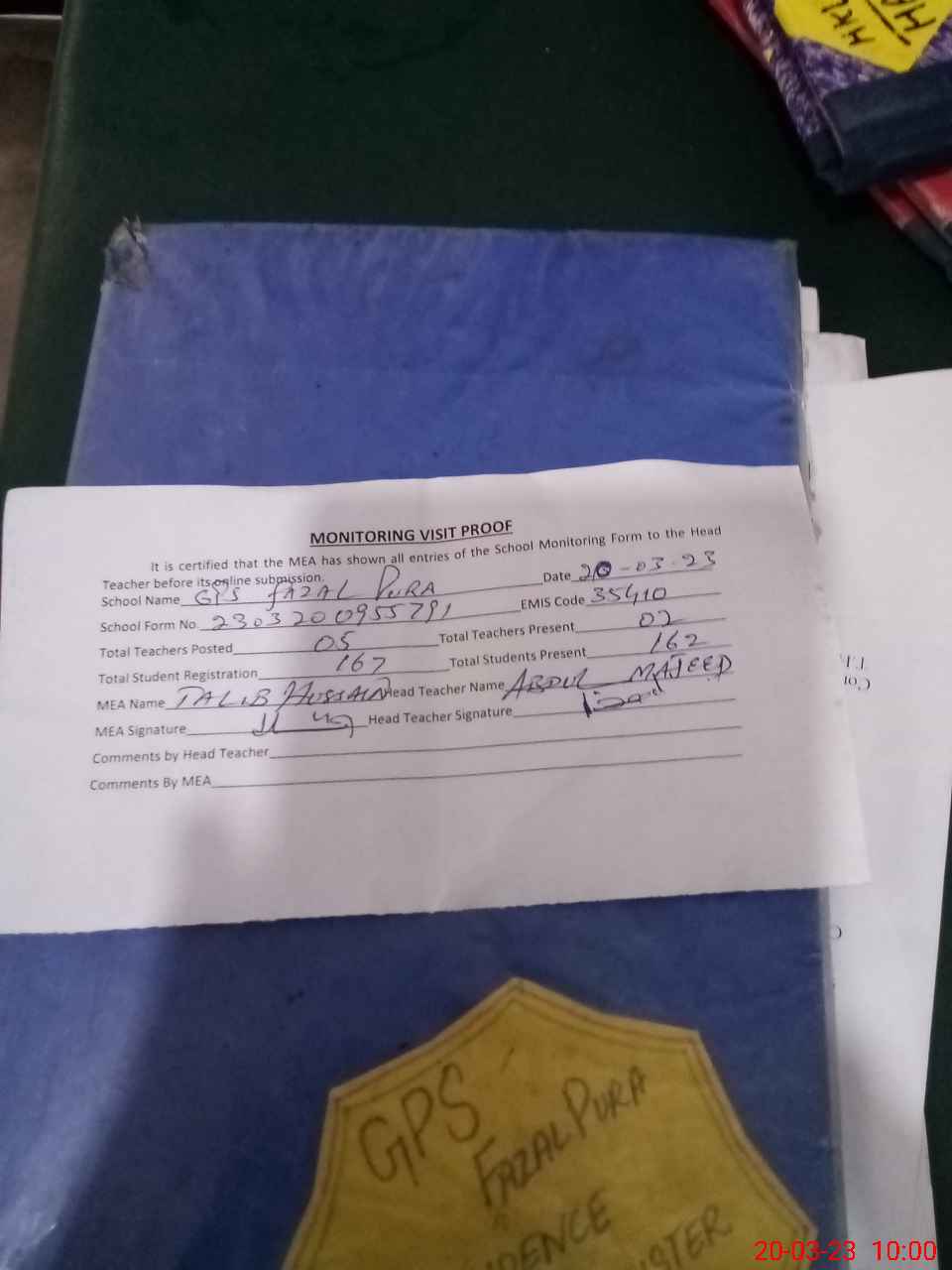 | Attendance Register | Head Teacher | MEA with School | Visit Proof |