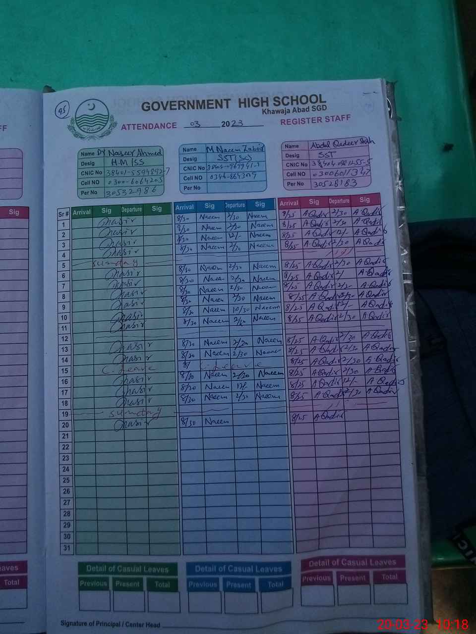 | CNIC | Full Name | Designation | R/C | Absence during last cal. month |