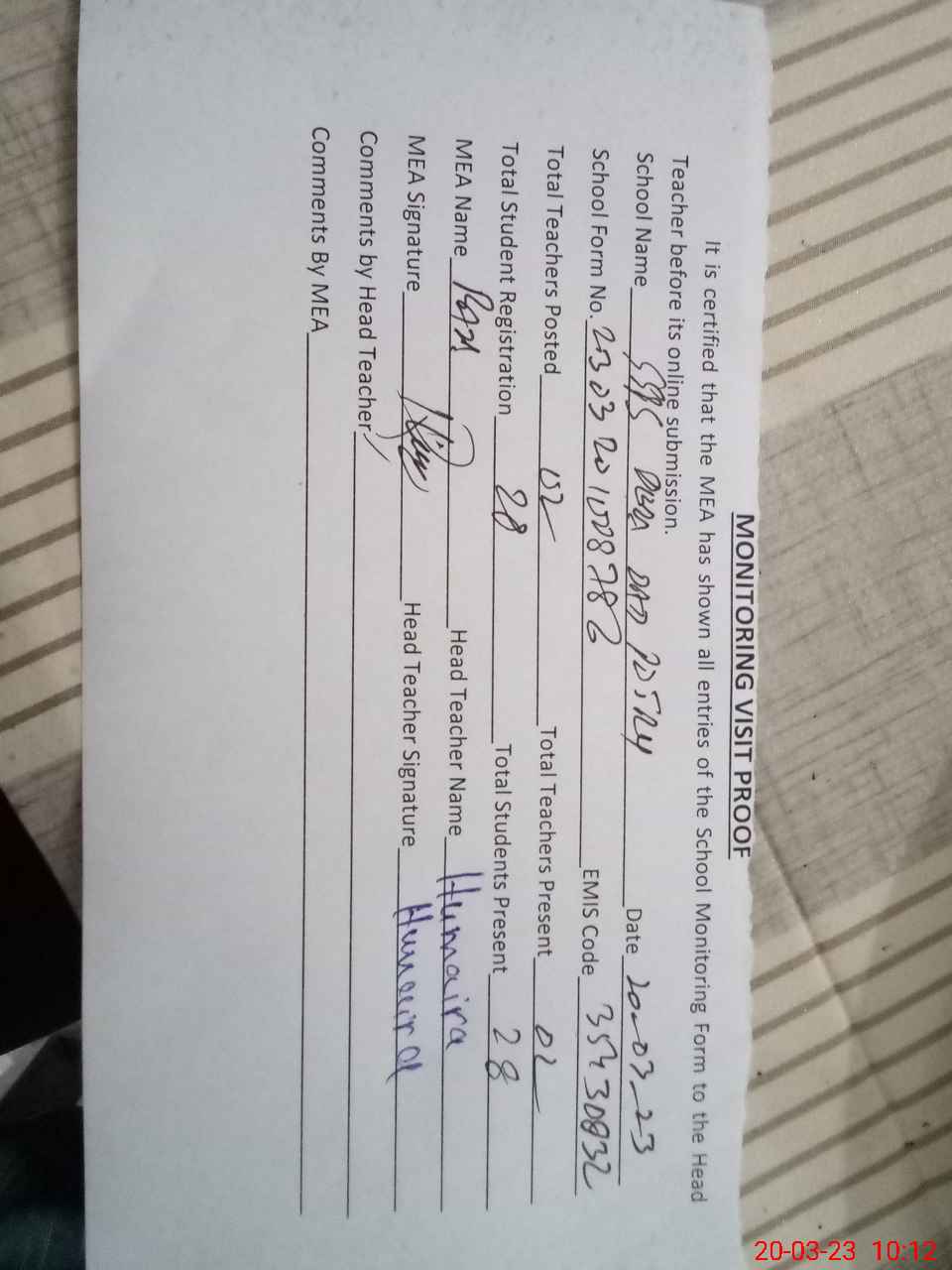 | Attendance Register | Head Teacher | MEA with School | Visit Proof |