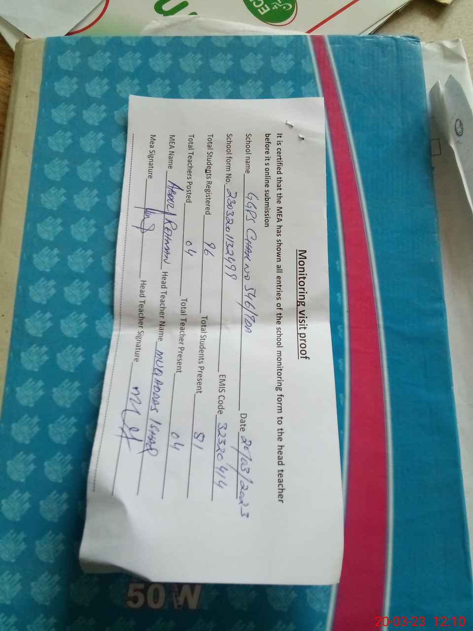 | Attendance Register | Head Teacher | MEA with School | Visit Proof |