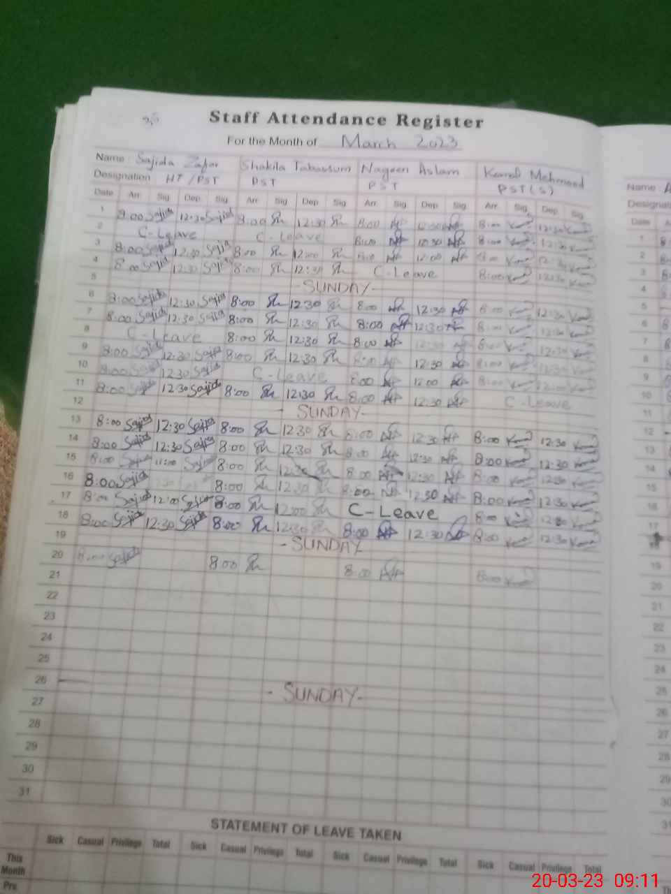 | CNIC | Full Name | Designation | R/C | Absence During Last Calender Month |