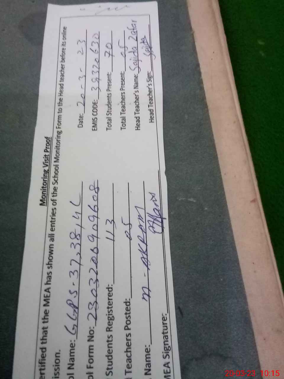 | Attendance Register | Head Teacher | MEA with School | Visit Proof |