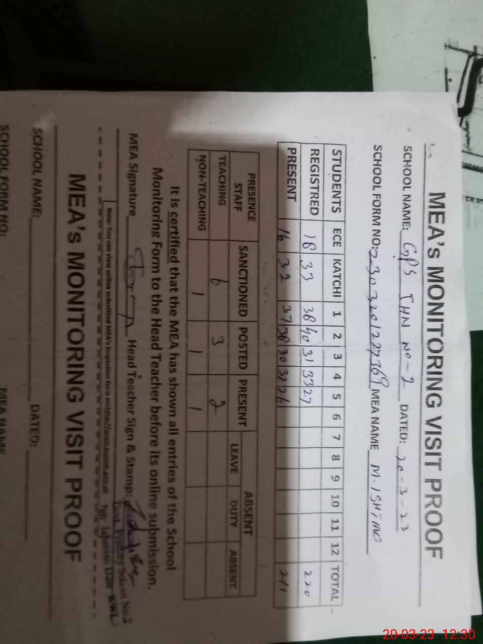 | Attendance Register | Head Teacher | MEA with School | Visit Proof |