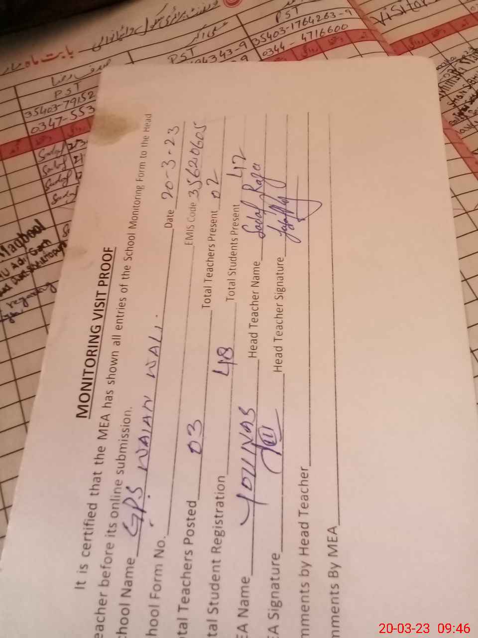 | Attendance Register | Head Teacher | MEA with School | Visit Proof |