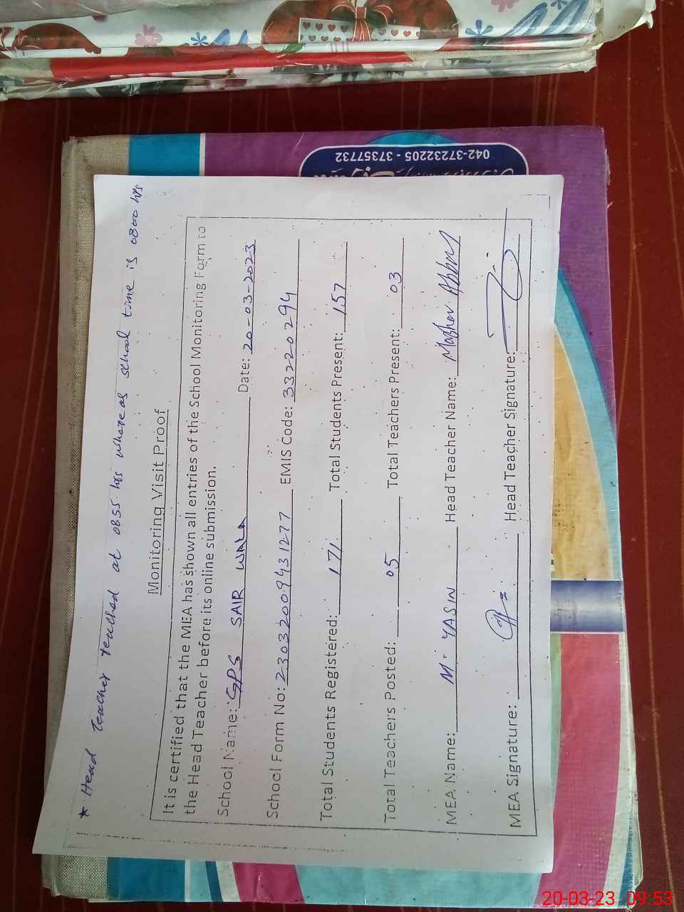 | EMIS Code: 33220294 | Name of School: GPS SAIR WALA | |||