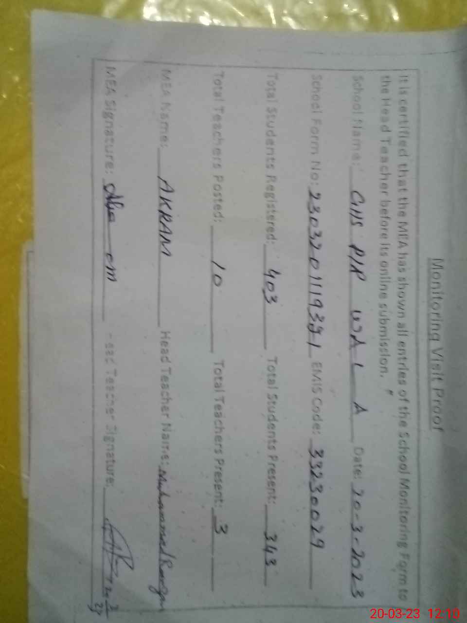 | Attendance Register | Head Teacher | MEA with School | Visit Proof |