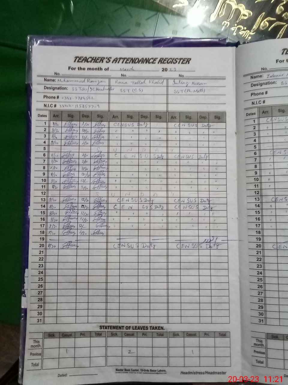 | CNIC | Full Name | Designation | R/C | Absence During Last Calender Month |