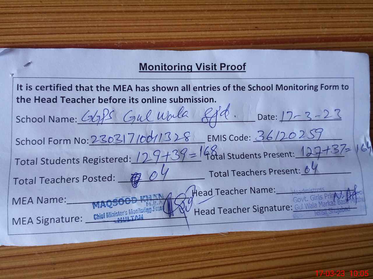 | EMIS Code: 36120259 | Name of School: GGPS GUL WALA SHUJABAD DISTT. MULTAN | |||