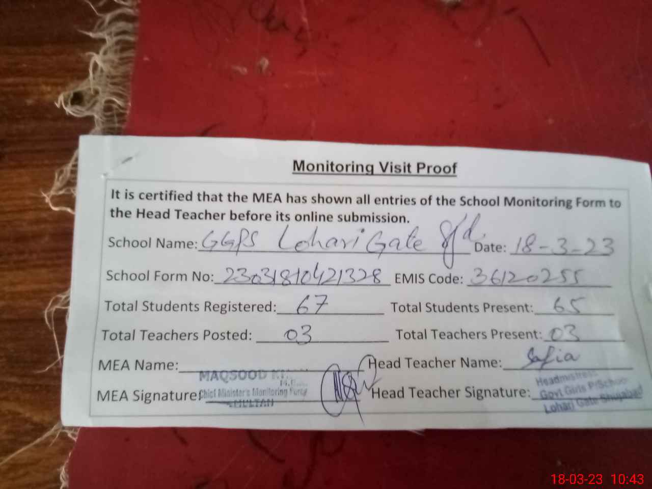 | Attendance Register | Head Teacher | MEA with School | Visit Proof |