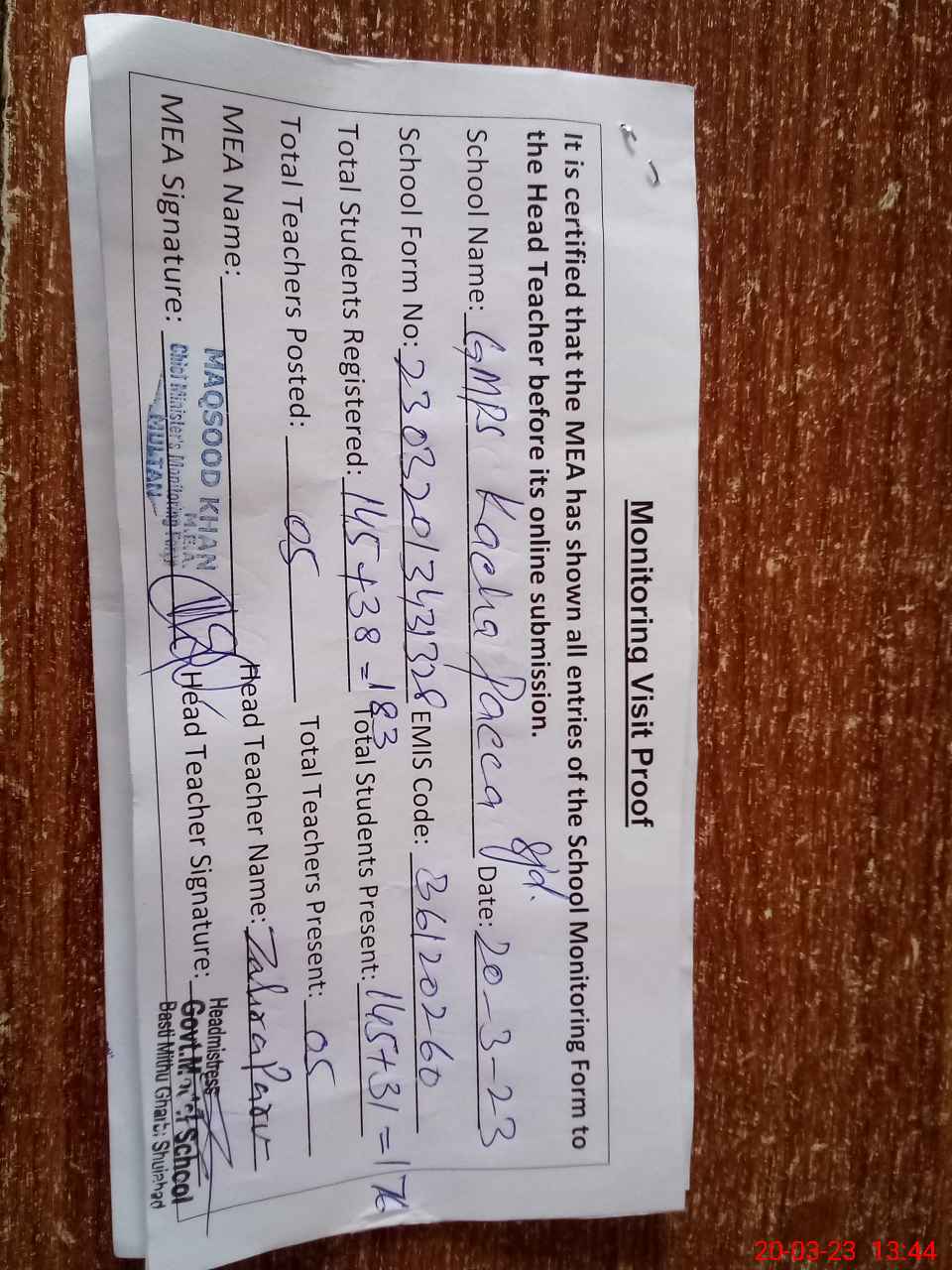 | Attendance Register | Head Teacher | MEA with School | Visit Proof |