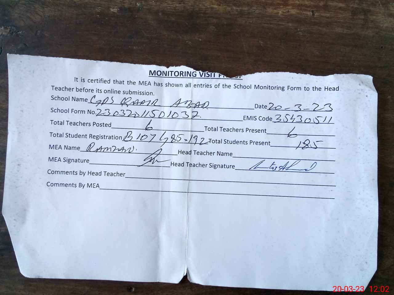 | Attendance Register | Head Teacher | MEA with School | Visit Proof |