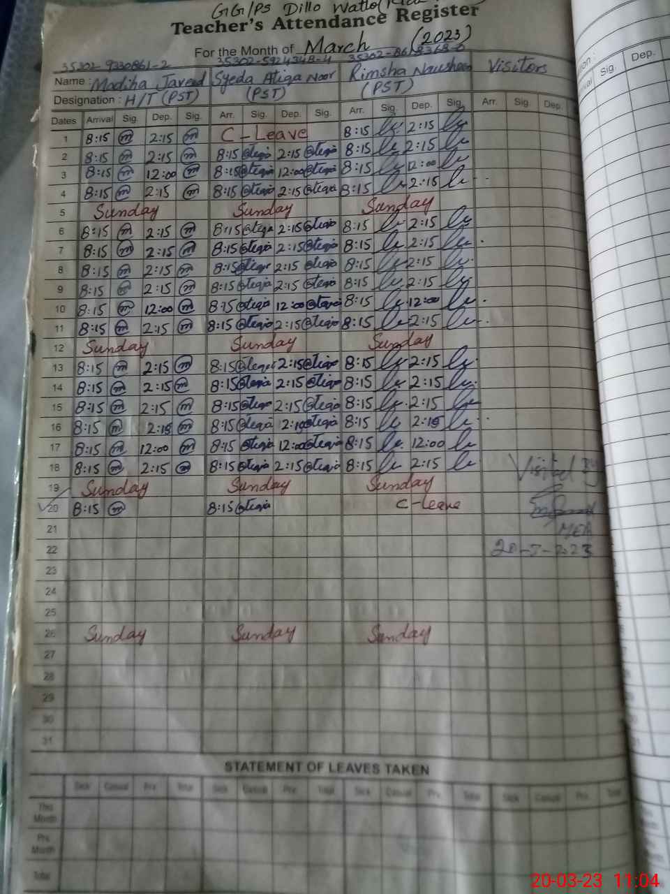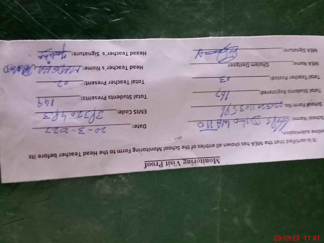 | Attendance Register | Head Teacher | MEA with School | Visit Proof |